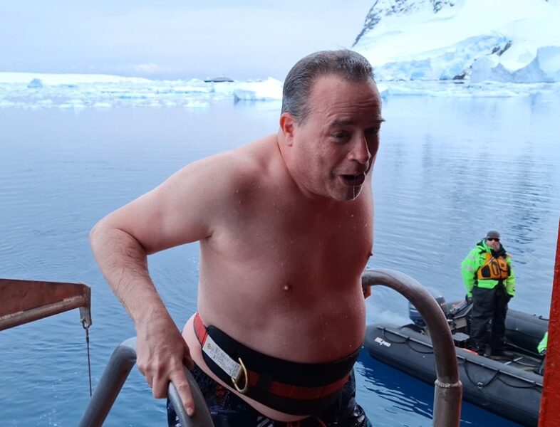 So, wearing Randy’s trucks with a tether wrapped around my waist, I jumped off the steps out of the gangway on the side of the ship into the frigid Antarctic waters.