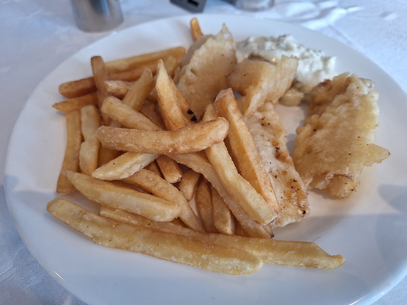 Today I didn’t even get to the buffet bar when he handed me a plate of gluten free battered fish and chips as the ones in buffet were breaded with flour.