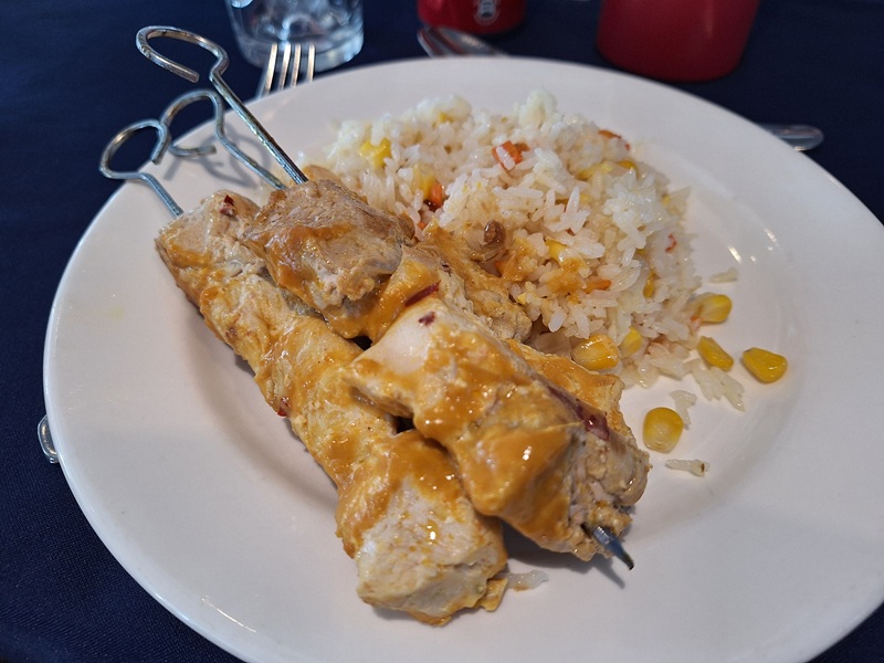 Randy, the head waiter, handed me a plate of gluten free fried race and I added the only thing I could to it – the Malaysian peanut chicken satay.