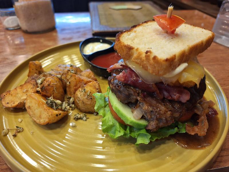 For dinner it was a humongous Aussie burger complete with patty, cheese, bacon, mushrooms, sauteed onions and a fried egg on gluten free bread.