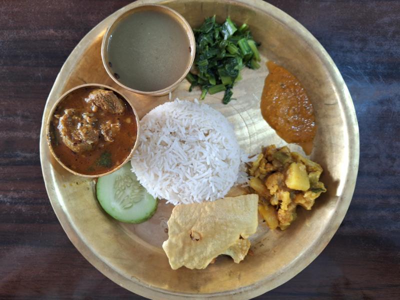 I ordered a Nepali khana set which is a plate of rice, dal, veg, achar sagh, dungruk, papad, salad, and mutton.